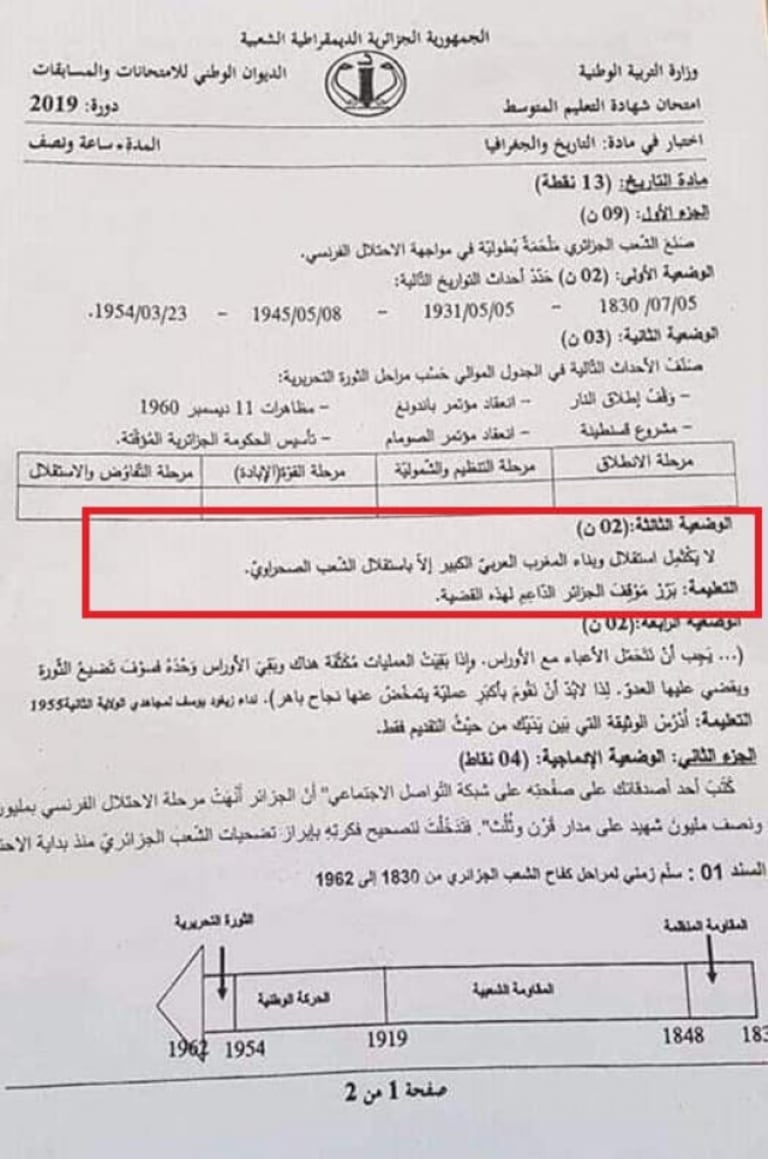 Dans le cadre de cette même supercherie historique, qui devrait servir d'épreuve d’Histoire, il est également demandé aux «Algériens de demain» d’expliciter la position d’Alger qui, vous ne le savez que trop!, est résolument hostile à l’intégrité territoriale du Royaume du Maroc.