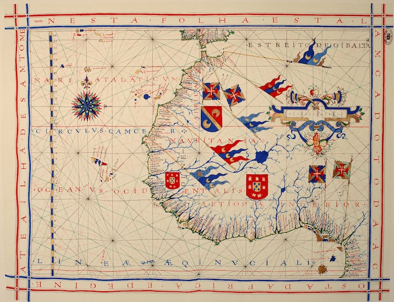 La cartographie historique constitue un volet notable des sources portugaises sur le Maroc. Les cartographes lusitaniens des XVème-XVIIème siècles ont produit de nombreuses cartes marines et terrestres détaillées du littoral marocain, jalonné de forts, de ports et de routes commerciales. Cette cartographie était jalousement gardée secrète à l’époque, tant elle revêtait une importance stratégique – elle était très disputée et convoitée par les puissances européennes d’alors. Quelques exemplaires de ces cartes ont traversé les siècles dans les collections portugaises. Outre l’atlas de Dourado (1571), l’ANTT conserve l’Atlas universel de João Teixeira Albernaz (1643), qui comporte des plans de villes et ports du Maroc. Une carte nautique de 1640 par le même Albernaz figure également ces côtes.