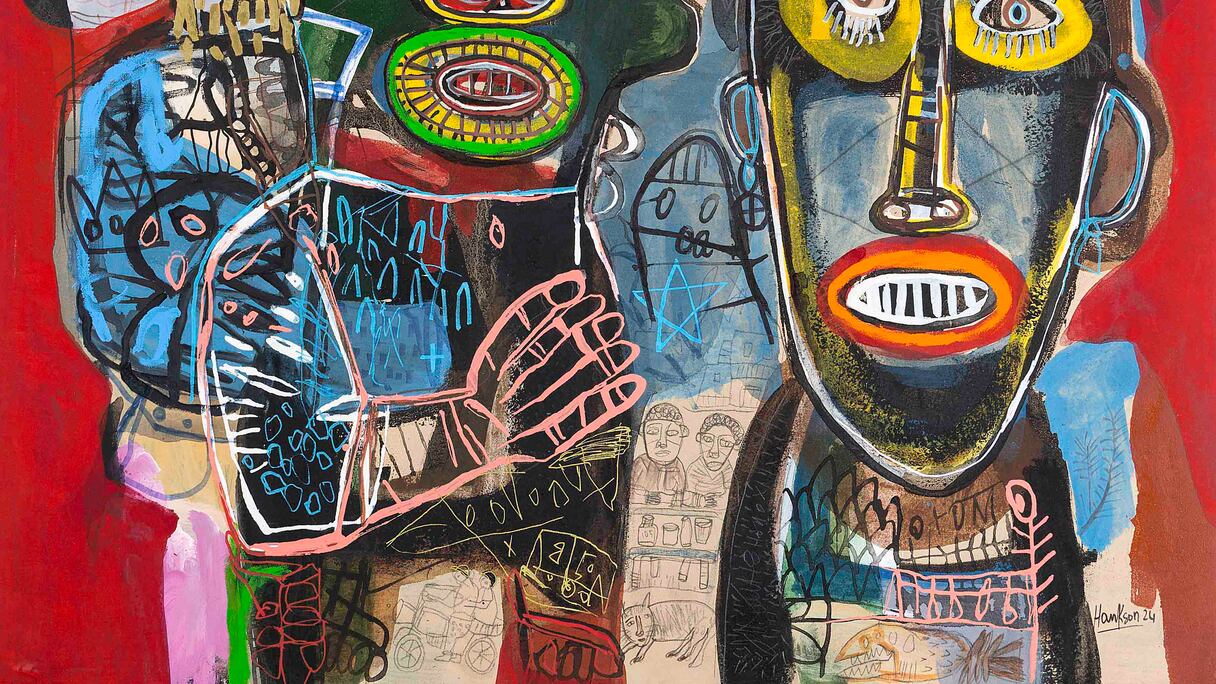 Plongé dès son enfance dans la culture traditionnelle de l’ouest du Cameroun et dans les rituels de sa tribu, Hako Hankson puise ses premières inspirations dans les objets des rites d’initiation qui l’entourent, tels que les masques ou les statuettes. L’artiste peint des scènes à la fois ancestrales et contemporaines, en opérant une jonction entre sa culture bamilékée et des références puisées dans l’histoire de l’art.