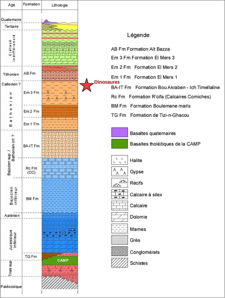 Trois dents fossiles de Turiasauriens, de gigantesques dinosaures herbivores du Jurassique moyen, ont été retrouvées dans la Formation El Mers III, près de Boulmane.