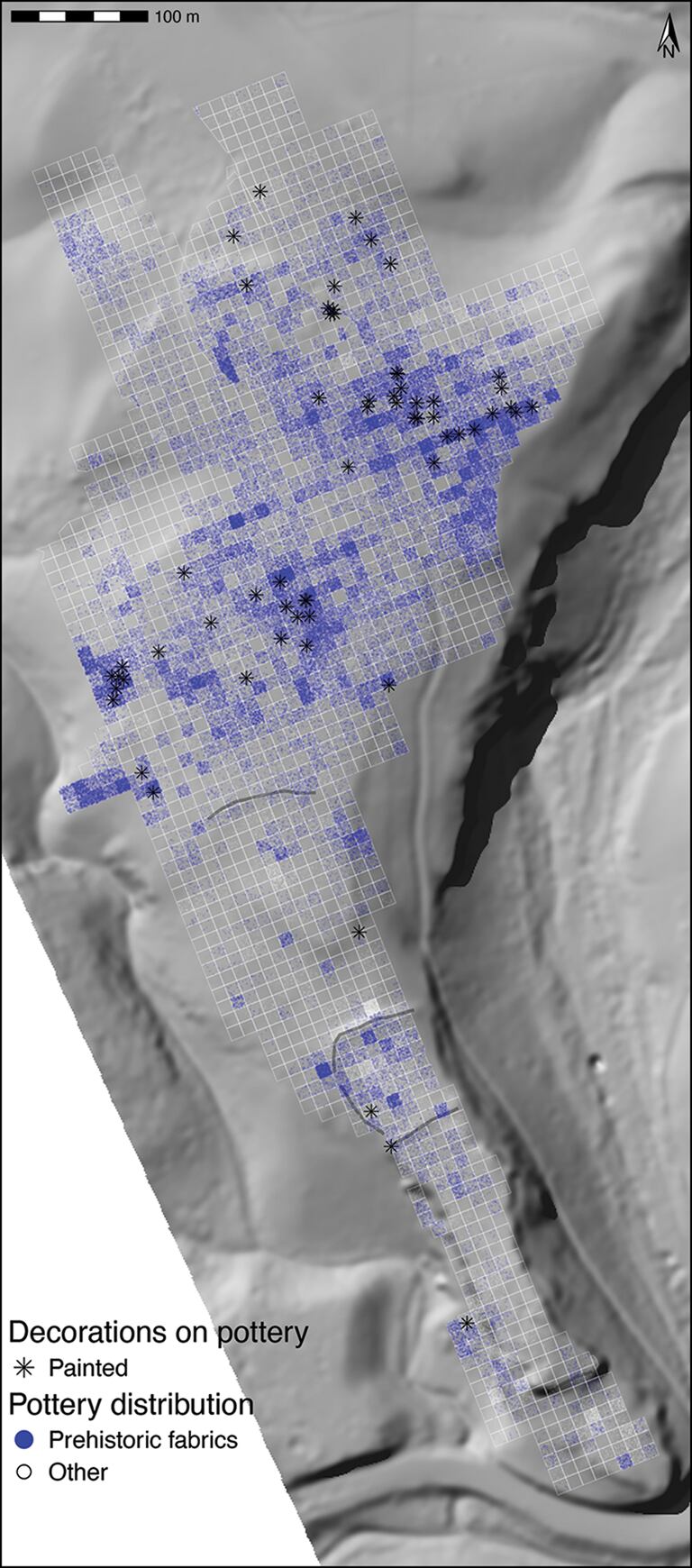 Répartition de poteries préhistoriques et de tessons peints du Néolithique final, sur le site archéologique d'Oued Beht
