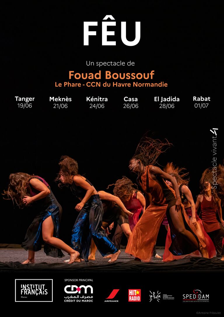 Avec FÊU, Boussouf poursuit un travail de recherche sur le mouvement, déjà amorcé avec Oüm (2020) et enrichi par ses collaborations avec des artistes visuels comme Ugo Rondinone (Burn to Shine, 2022). Né au Maroc et arrivé en France à l’âge de 7 ans, il puise dans une double culture nourrie de traditions orales, de sciences sociales et de pratiques urbaines. En 2006, il fonde la Compagnie Massala et affirme une signature chorégraphique fluide, cyclique, toujours portée par l’émotion et l’intensité du présent. Aujourd’hui à la tête du Phare– Centre chorégraphique national du Havre Normandie, il est également Chevalier des Arts et des Lettres.