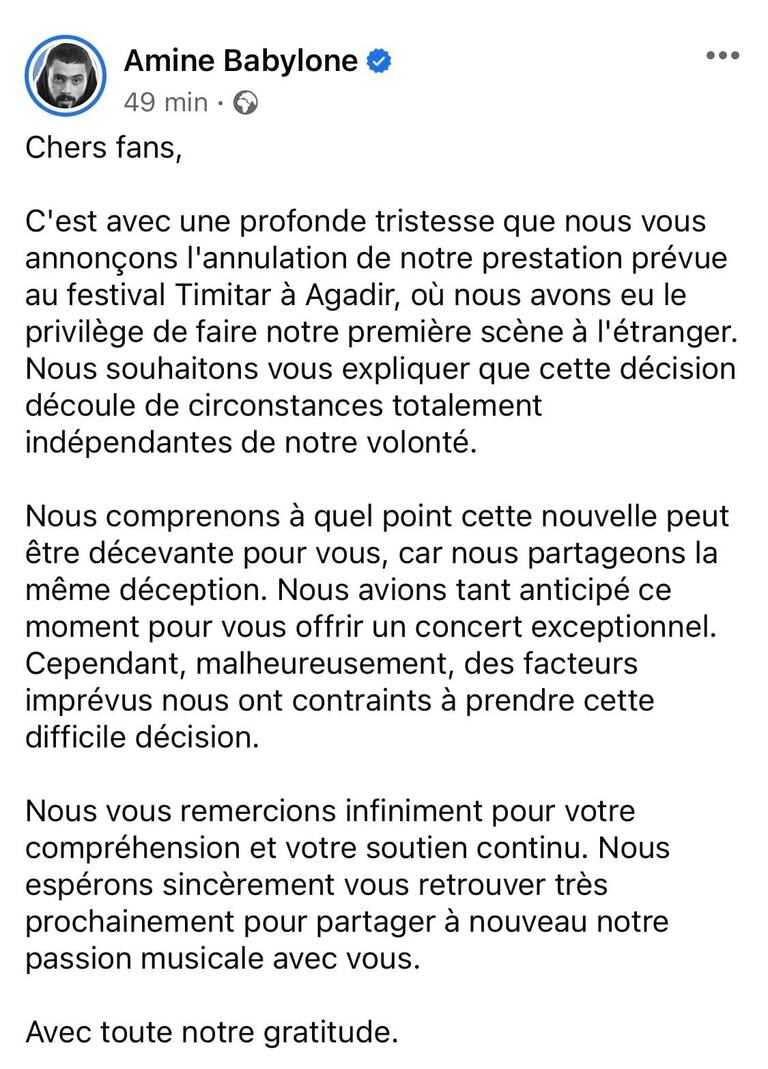 Le mercredi 6 septembre, les organisateurs du festival Timitar ont confirmé l’annulation du concert d’Amine Babylone, citant à leur tour des «circonstances indépendantes de (leur) volonté».