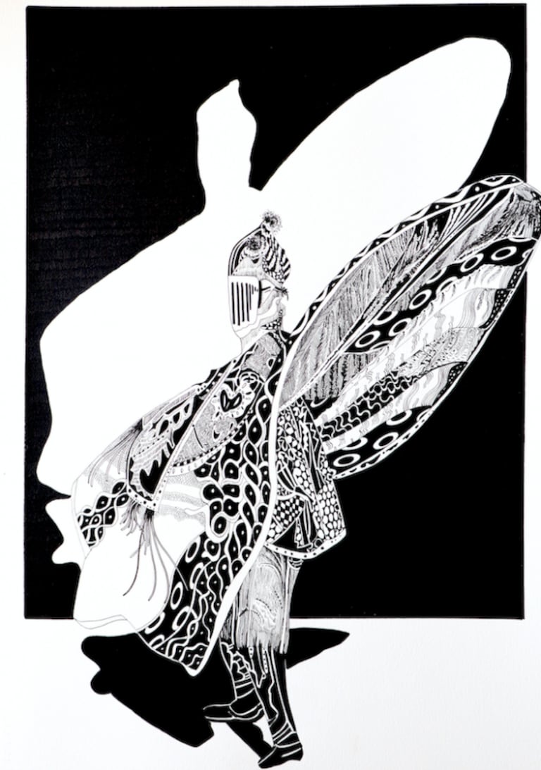 Le continent africain est en effet au cœur du projet artistique de Chourouk Hriech montré à Londres. L’artiste construit de nouveaux espaces s’imprégnant d’une réalité qui semble avoir été inventée, d’une réalité au seuil de la fiction. Chourouk Hriech s’intéresse également à la question du vêtement, en proposant une série de dessins consacrée aux costumes de cérémonies d’Afrique. Dans ces dessins, aucun visage n’apparaît. Les figures disparaissent derrière des masques pour laisser la place aux motifs et ornements.
