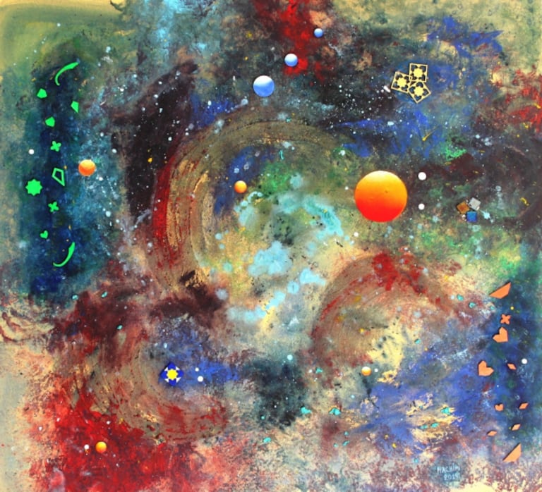 "Cette combinaison offre un immense champ d’exploration sur les couleurs et les formes et donne aussi un prolongement spirituel et parfois ésotérique à ses toiles", peut-on lire dans la présentation de son exposition.