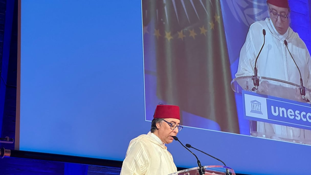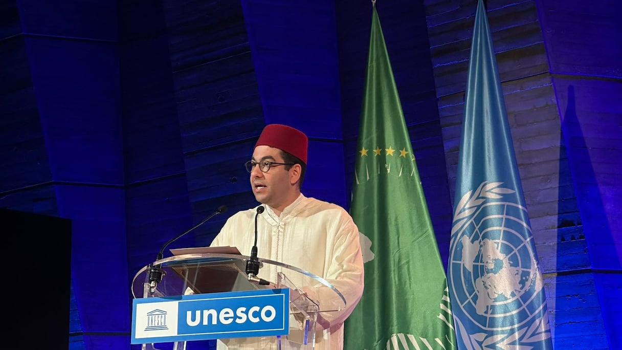 Mohamed Mehdi Bensaid, Ministre de la jeunesse, de la culture et de la communication lors de son discours à l'occasion de la cérémonie d'ouverture de la semaine africaine 2024, le 22 mai au siège de l'Unesco à Paris.