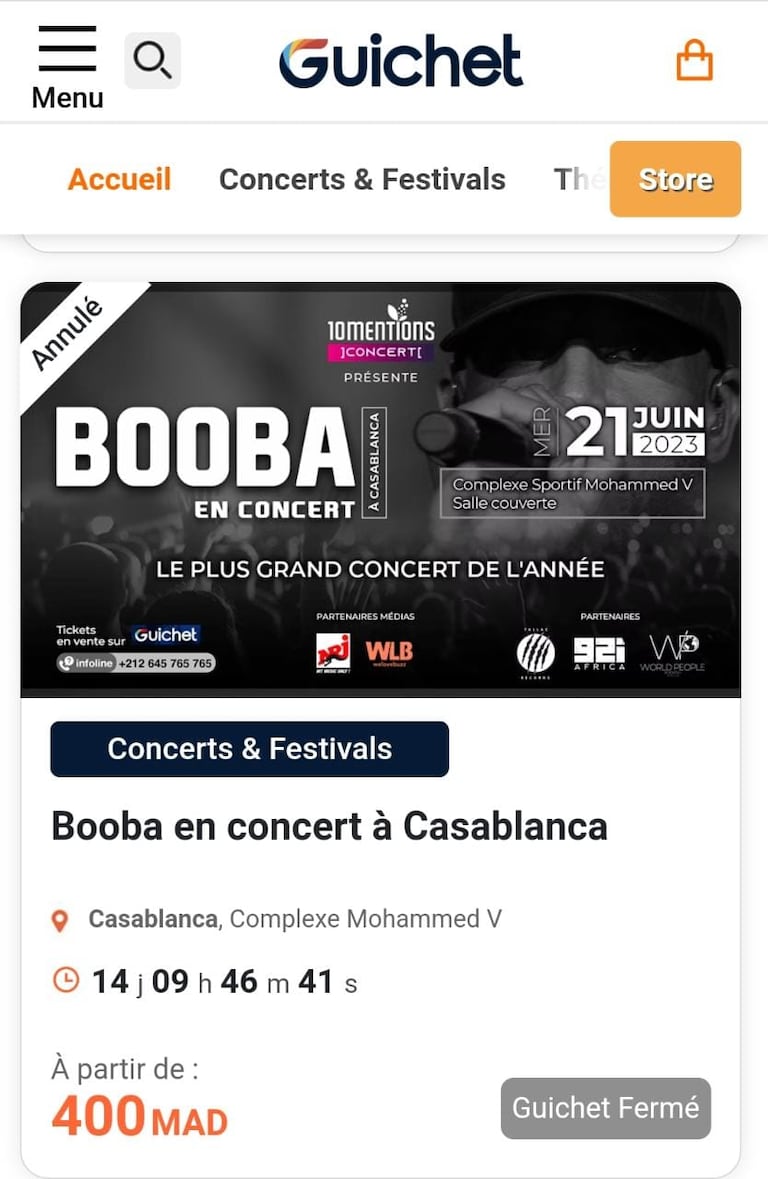 Depuis hier mardi 6 juin, il est désormais impossible d’acheter un ticket pour le concert de Booba via l’application ou le site de guichet.ma. «Guichet fermé», est-il indiqué en dessous de l’affiche estampillée de la mention «annulé». Les numéros de téléphone du site de réservation, ainsi que ceux de l’organisateur sont quant à eux aux abonnés absents… Impossible d’en savoir plus.
