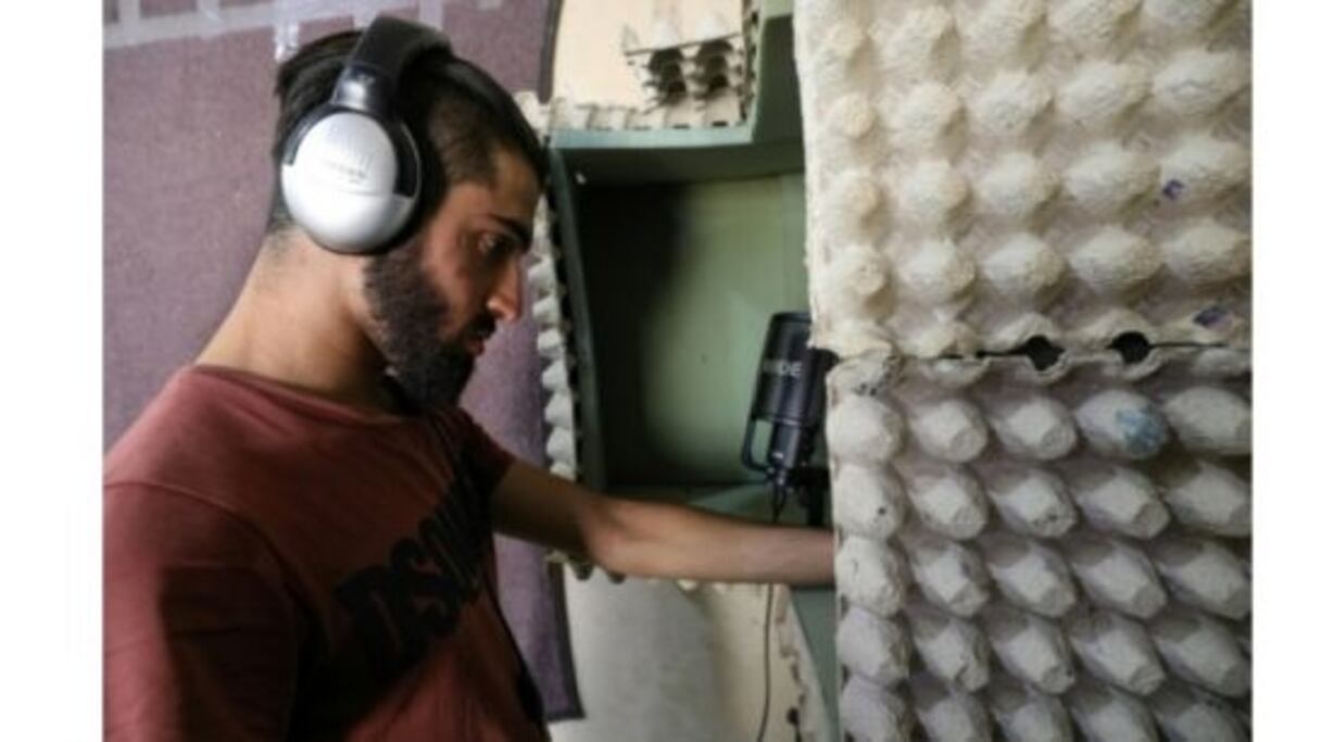 Dans un coin de sa chambre, dans sa maison à Maaret al-Noomane, il s'est improvisé un petit studio d'enregistrement, avec des boîtes d'oeufs et des plaques de mousse aux murs.