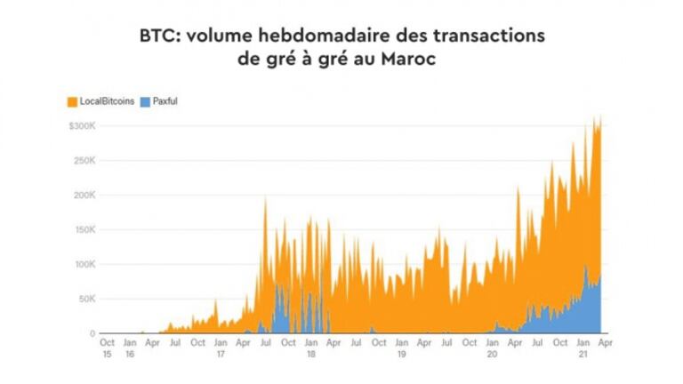 De plus en plus de Marocains bravent toutefois cette interdiction. De novembre 2017 à février 2021, les volumes de trading sur la plateforme LocalBitcoins ont connu une forte augmentation, de l'ordre de 215% dans le Royaume.