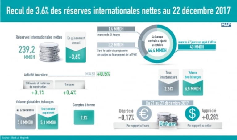 Le taux de croissance des dépôts à vue auprès des banques a, toutefois, baissé de 7,4% à 7,3%, tandis que celui des détentions en titre d'OPCVM a reculé de 7,2% à 6,6%. Au cours de la semaine allant du 21 au 27 décembre 2017, le dirham s’est déprécié de 0,17% par rapport à l’euro et s’est apprécié de 0,28% vis-à-vis du dollar, fait savoir BAM.