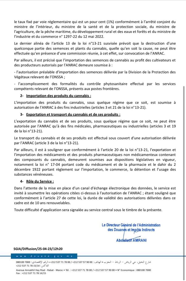 Par ailleurs, la circulaire de l’ADII précise que l’exportation et l’importation des médicaments et des produits pharmaceutiques non médicamenteux contenant des composants du cannabis demeurent soumises aux dispositions législatives en vigueur, notamment la loi n° 17-04 portant Code du médicament et de la pharmacie, et le dahir du 2 décembre 1922 portant règlement sur l’importation, le commerce, la détention et l’usage des substances vénéneuses.