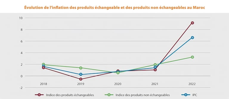 Cependant, le début de l’année 2022 a été marqué par une montée des tensions inflationnistes d’origine externe. En effet, les prix des produits échangeables ont vu leur rythme d’accroissement s’accentuer de 9,1% contre 3,2% pour les produits non échangeables, dans un contexte marqué par la persistance des pressions inflationnistes chez les partenaires étrangers, notamment dans la zone euro, principal partenaire du Maroc.
