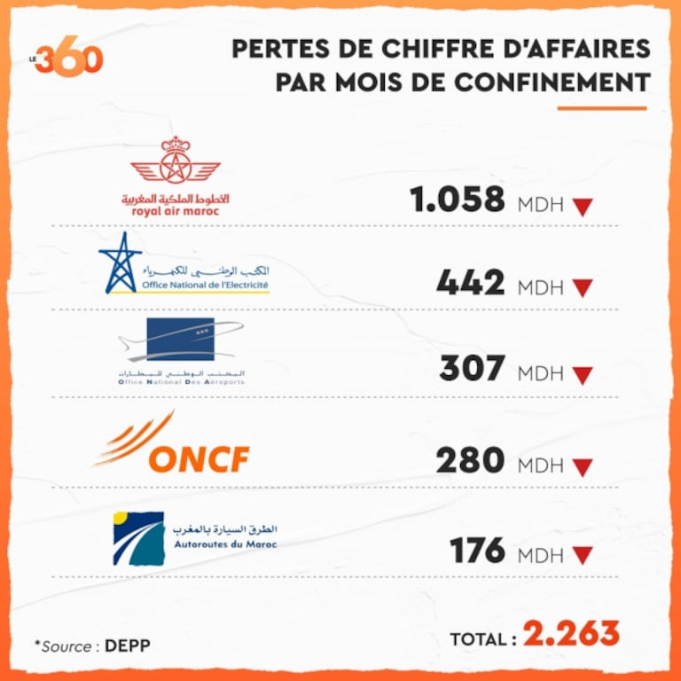 Les cinq plus grosses pertes de chiffre d’affaires ont été enregistrées par Royal Air Maroc (environ 1 milliard de dirhams par mois), l’ONEE (442 millions de dirhams), l’ONDA (307 millions de dirhams), l’ONCF (280 millions de dirhams) et Autoroutes du Maroc (176 millions de dirhams).