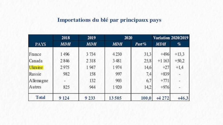 Les stocks de blé sont confortablesL’Ukraine et la Russie font partie des principaux pays fournisseurs du Maroc en blé. En 2020, les importations de blé au Maroc proviennent pour 21% de ces deux pays. On peut donc penser que l’offensive militaire russe risque de perturber l’approvisionnement en céréales du Maroc.
