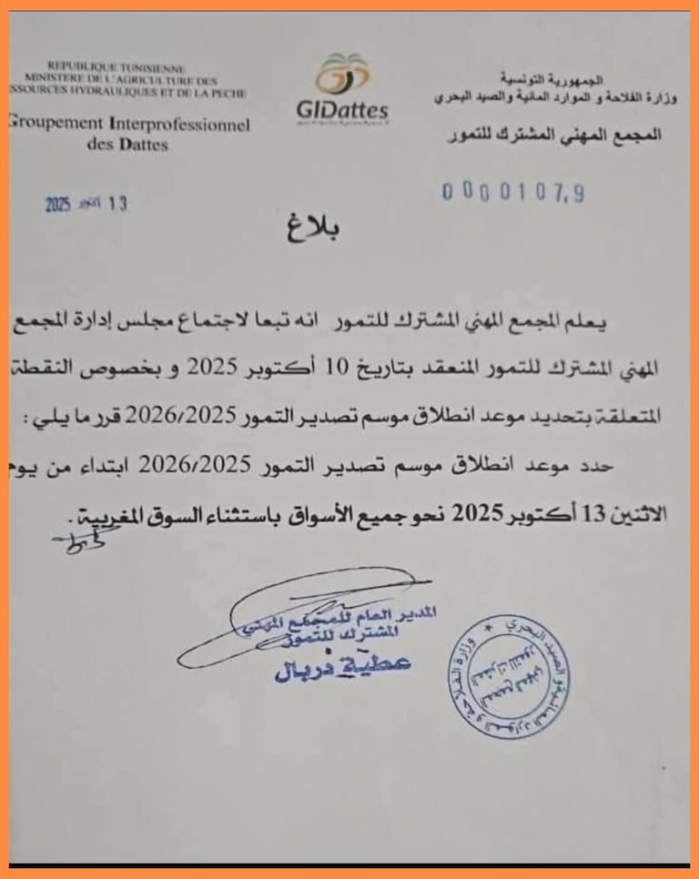 Dans un communiqué publié le 13 octobre 2025, le Groupement interprofessionnel des dattes (GID), rattaché au ministère tunisien de l’Agriculture, a annoncé le lancement de la campagne d’exportation des dattes pour la saison 2025/2026.
