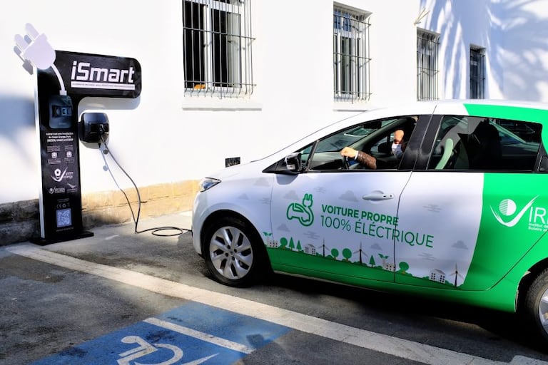 Un automobiliste recharge la batterie de son véhicule électrique sur une borne de recharge fabriquée par la start-up marocaine EV I-Smart.