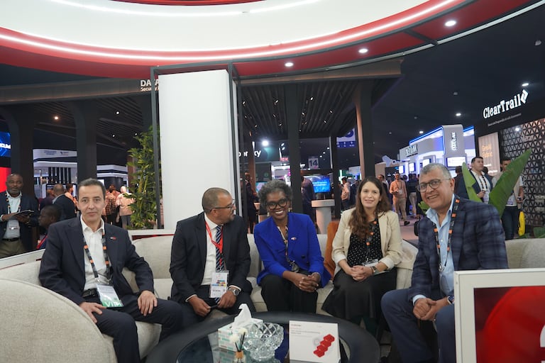 De d à g: Reda Bakkali, CEO de INEOS, Marissa Scott, consule générale des États-Unis à Casablanca, et Youssef Fouzi, Country Manager chez Fortinet, mardi 15 avril 2025 à Marrakech. (Y.ElHarrak/Le360)