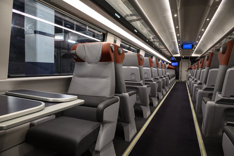 Une vue de l'intérieur de première classe à bord de l'Avelia Liberty, un TGV construit par Alstom pour l'opérateur ferroviaire américain Amtrak.