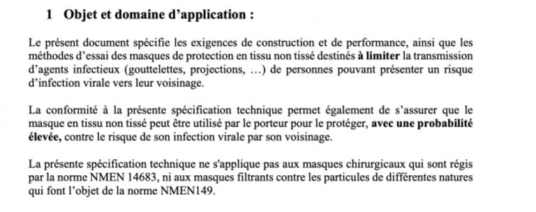 Les paramètres ayant présidé à la mise en place de cette norme sont la filtration (technologie SS garantissant une meilleure capacité de filtration de gouttelettes), la respirabilité, la perméabilité et la limitation des effets secondaires (tissus exempts de métaux lourds), etc.