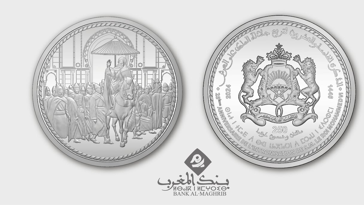À l’occasion du 25ème anniversaire de l’accession du roi Mohammed VI au trône, Bank Al-Maghrib a émis une pièce commémorative, en argent, d’une valeur faciale de 250 dirhams.