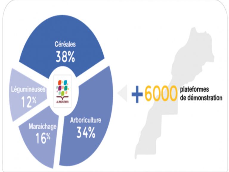 A travers le programme Al Moutmir, le groupe OCP a mis en place une offre de plateformes de démonstration dans différentes provinces du Royaume, couvrant plusieurs cultures (céréales et légumineuses, arboriculture, maraîchage...). Ces plateformes se veulent un outil de vulgarisation en matière de démonstration des recommandations scientifiques et d’innovations agricoles.
