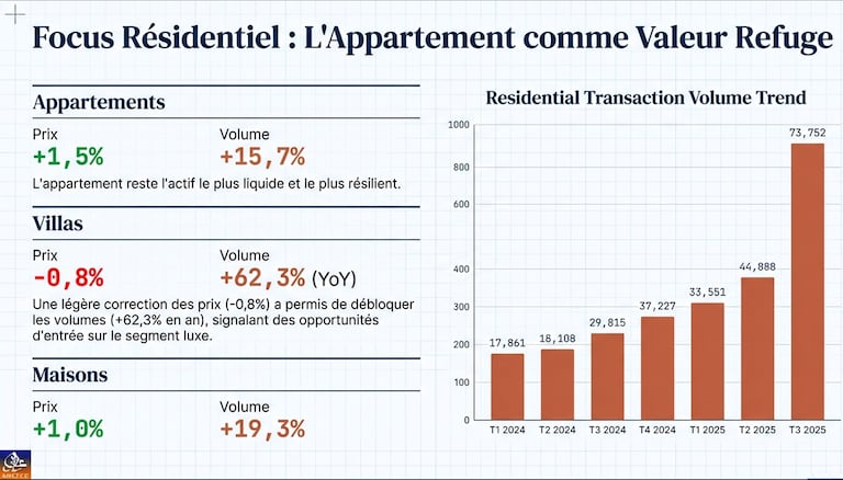 Dans le détail sectoriel, le résidentiel confirme son rôle stabilisateur. Les prix progressent de 1,5% en glissement annuel et les volumes de 25,7%. Le segment des appartements apparaît comme le plus résilient, avec une hausse des prix de 1,5% et des transactions de 15,7% au trimestre. Dans cette dynamique, les villas enregistrent un léger recul des prix de -0,8% mais une forte reprise des volumes +62,3% en glissement annuel, ce qui peut traduire un ajustement préalable des valorisations favorisant le retour des acheteurs.