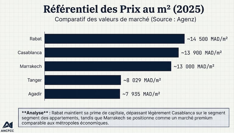 Les référentiels de prix au mètre carré pour 2025 montrent que Rabat conserve une prime avec environ 14.500 MAD/m² pour les appartements, contre 13.900 MAD/m² à Casablanca. Marrakech, de son côté, se positionne dans le même segment autour de 13.000 MAD/m², tandis que Tanger et Agadir affichent des niveaux inférieurs, selon la publication conjointe de Bank Al-Maghrib et de l’ANCFCC. Ainsi, cette hiérarchie reflète des déterminants économiques différenciés que sont la centralité administrative et le pouvoir d’achat à Rabat, la profondeur du marché et la diversification économique à Casablanca, la demande étrangère à Marrakech, l’expansion foncière à Tanger.