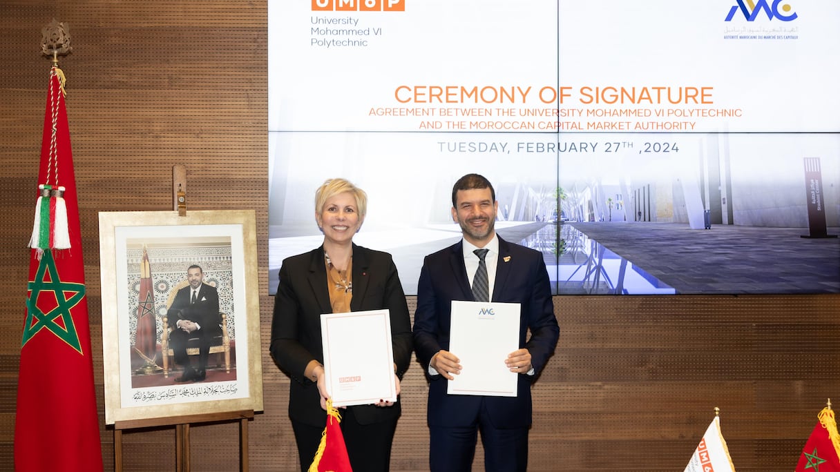 L’Autorité marocaine du marché des Capitaux (AMMC) et l’Université Mohammed VI polytechnique (UM6P) s’associent pour renforcer l’éducation financière et l’innovation au Maroc. Les deux institutions ont signé, mardi 27 février, un accord de partenariat qui vise à renforcer les liens entre elles dans divers domaines, notamment l’éducation financière, la recherche, la formation des professionnels de la finance, l’innovation financière et l’entrepreneuriat, indique un communiqué conjoint.