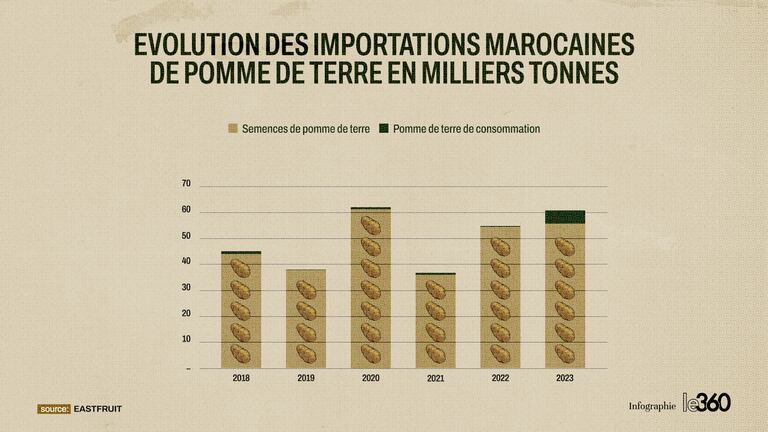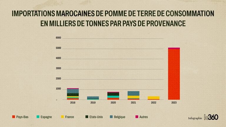 Le Maroc, important pays exportateur de pommes de terre, en importe aussi. Et si, entre 2018 et 2022, les importations marocaines ont rarement dépassé le millier de tonnes, elles ont décuplé en 2023, atteignant selon EastFruit 5.000 tonnes. Le marché de provenance de la patate que les Marocains consomment reste principalement les Pays-Bas.