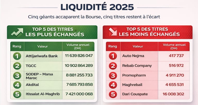 L’année 2025 a accentué la polarisation des volumes confirmée par Attijariwafa Bank qui s’impose comme la valeur la plus liquide avec 11,64 MMDH échangés, devant TGCC à 10,90 MMDH. Marsa Maroc, Akdital et Itissalat Al-Maghrib complètent le quinté de tête, confirmant l’attractivité des grandes capitalisations bancaires, industrielles et de services.