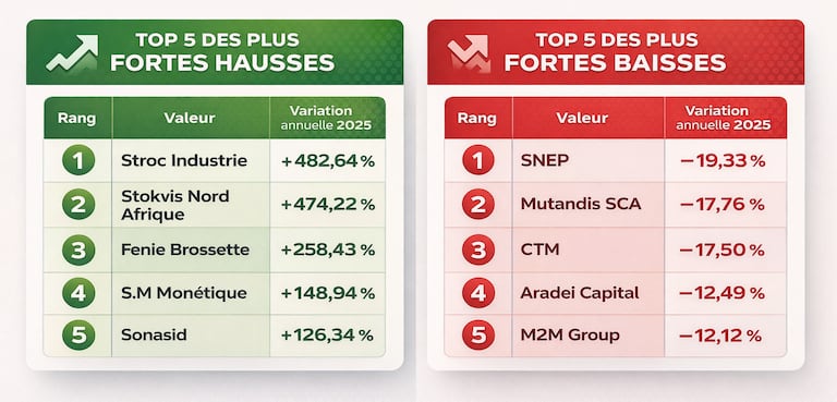 L’année 2025 a consacré une hiérarchie de performances d’une ampleur rare. Stroc Industrie domine très largement la cote avec une progression de +482,64%, incarnant le symbole le plus abouti du re-rating boursier observé cette année. Dans son sillage immédiat, Stokvis Nord Afrique affiche +474,22%, confirmant un repositionnement radical du regard des investisseurs. Fenie Brossette complète ce trio de tête avec +258,43%, tandis que S.M Monétique, en hausse de +148,94 %, a bénéficié de l’attrait soutenu pour les technologies de paiement. Sonasid ferme ce Top 5 avec +126,34 %, porté par le redressement du cycle sidérurgique.