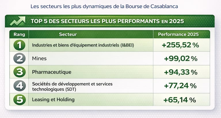 Côté secteur, la dynamique sectorielle s’est révélée extrêmement concentrée. Les Industries et biens d’équipement industriels (I&BEI) survolent la cote avec une performance exceptionnelle de +255,52%, sans équivalent en 2025. Les Mines suivent avec +99,02%, soutenues par la fermeté des cours des matières premières. Le compartiment Pharmaceutique progresse de +94,33%, confirmant son profil défensif à forte croissance. Dans cette dynamique, les services technologiques (SDT) enregistrent +77,24%, illustrant l’essor des activités digitales, tandis que le secteur Leasing et Holding clôt le Top 5 avec +65,14%, porté par l’investissement et la reprise du crédit.