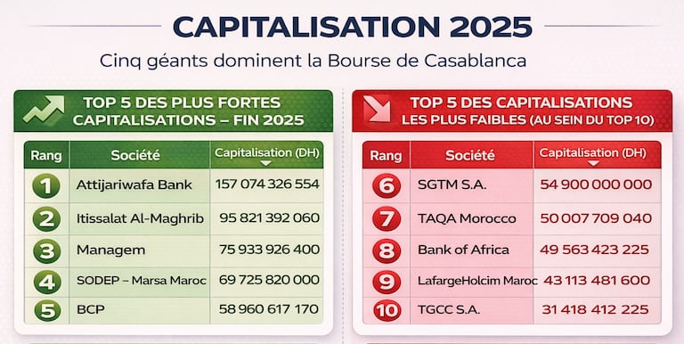 Pour l’exercice 2025, la hiérarchie des capitalisations confirme la domination d’Attijariwafa Bank avec 157 MMDH, soit plus de 15% de la capitalisation globale. Itissalat Al-Maghrib suit avec 95,8 MMDH, devant Managem à 75,9 MMDH. Marsa Maroc et BCP complètent le Top 5 avec respectivement 69,7 et 59 MMDH.