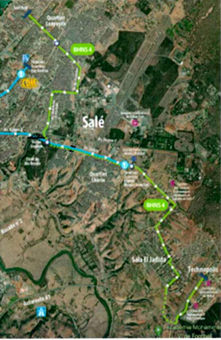 La dernière ligne BHNS 4, longue de 18,5 km, relie l’arrondissement de Laayayda au pôle de Technopolis, intégrant cet arrondissement au tissu urbain de l’agglomération et favorisant l’interconnexion et l’inclusion de ses habitants. Elle dessert notamment le pôle universitaire de Salé et la zone en développement Technopolis avec ses multiples équipements (université internationale de Rabat, futur hôpital universitaire de l’UIR, Université Mohammed 6).