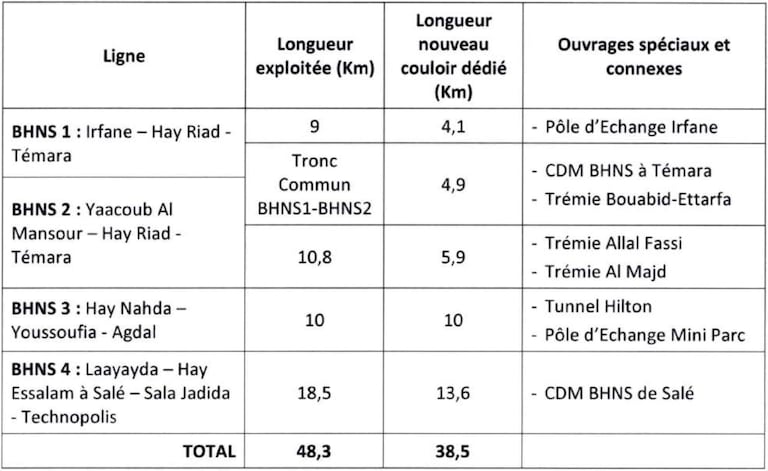 À l’issue de la phase des études d’avant-projet, la Société de développement local «Rabat Région Mobilité» a dévoilé de nouveaux détails autour de son projet de busway. Une infrastructure de grande envergure, qui s’étend sur un linéaire de 48,3 kilomètres de lignes exploitées, dont 38,5 km aménagés en nouveau couloir dédié, sera structurée en quatre lignes d’exploitation désignées BHNS1, BHNS2, BHNS3 et BHNS4.