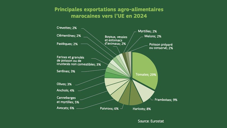 Depuis l’entrée en vigueur de l’accord agricole en 2012, les exportations agricoles marocaines à destination de l’UE ont plus que triplé (3,1 fois) pour se situer à 3,4 milliards d’euros en 2024, pesant 14% des exportations marocaines globales vers l’UE.