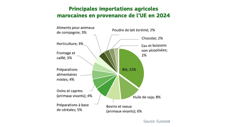 De l’autre côté de la balance, avec un volume de 3,7 millions de tonnes enregistré en 2024 (785 millions d’euros), le blé est le principal produit agricole importé par le Maroc en provenance de l’UE. Les importations de blé tendre représentent, en valeur, 22% des importations totales agricoles depuis l’UE en 2024.