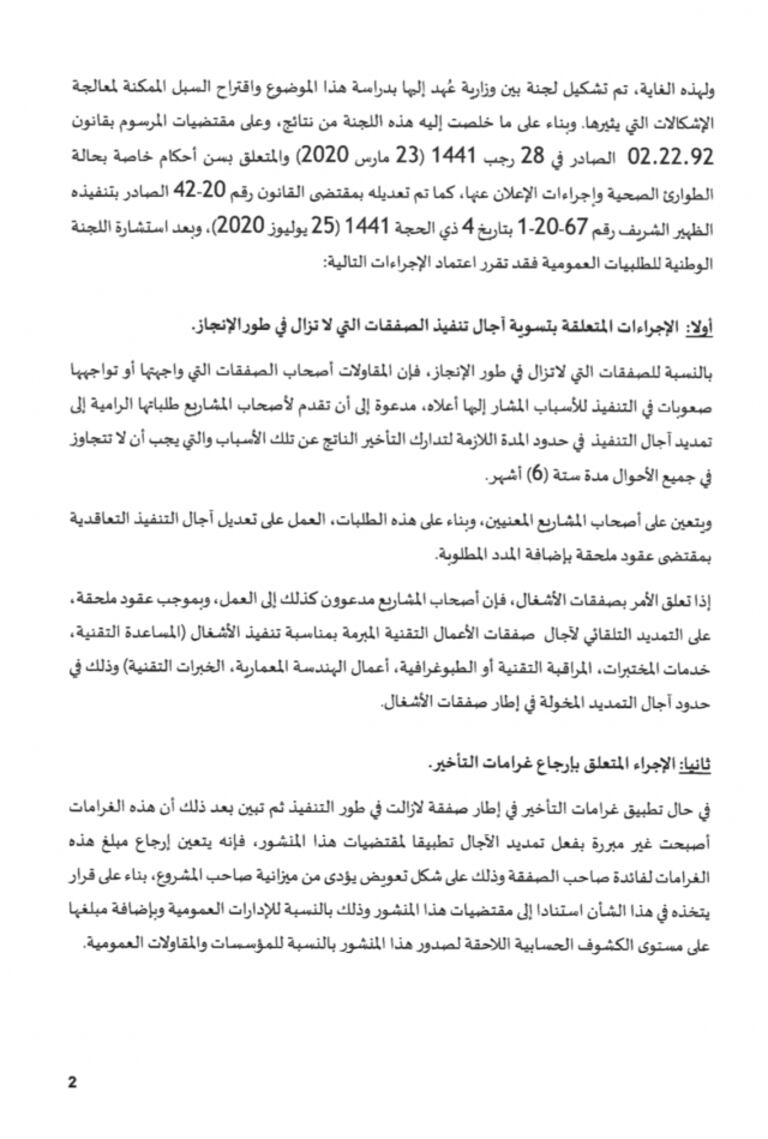 Les entreprises concernées peuvent bénéficier d’une prorogation des délais d’exécution des marchés en cours, pouvant atteindre six mois, ce qui va leur éviter d’écoper de pénalités de retard. La circulaire prévoit de formaliser cette prorogation à travers des contrats annexes.