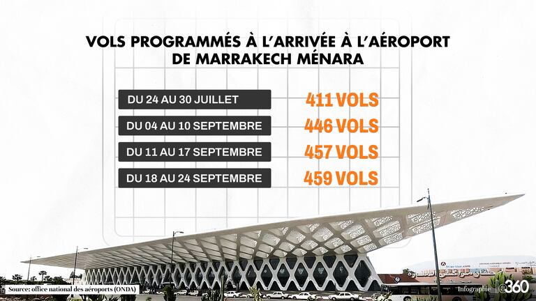 Selon les statistiques de l’Office national des aéroports (ONDA), la moyenne des vols hebdomadaires programmés vers l’aéroport de Marrakech-Ménara a été préservée avec 446 vols ayant atterri à Marrakech du 4 au 10 septembre. Durant la semaine suivant le séisme (du 11 au 17 septembre), 457 vols ont été enregistrés alors que 459 vols sont programmés au total pour cette semaine (du 18 au 24 septembre).