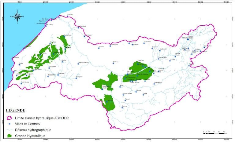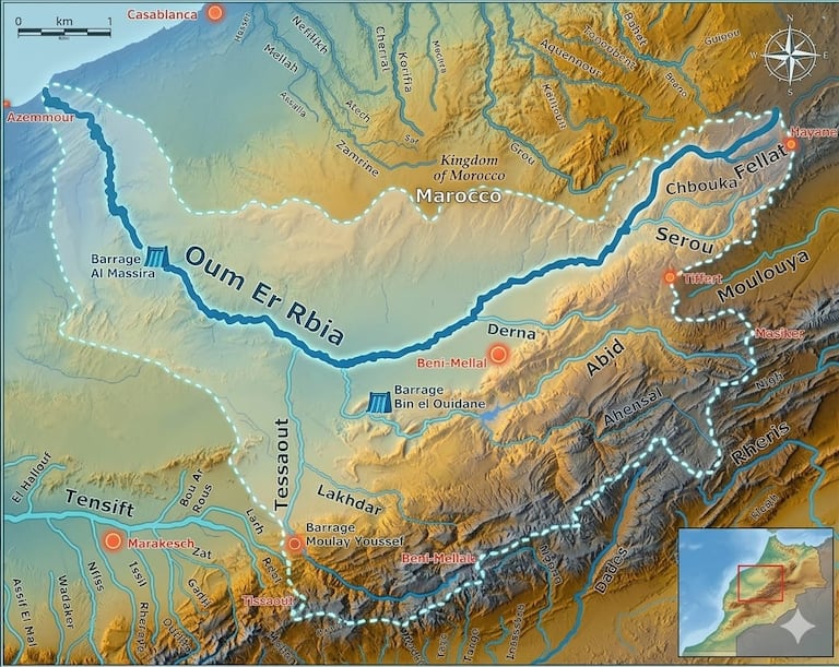 Oum Er-Rbia constitue le cœur d’un bassin hydraulique de près de 48.000 km², deuxième bassin du Maroc après celui du Sebou, couvrant 16 provinces et cinq régions. Il assure l’alimentation en eau potable d’environ 10 millions de personnes, soit près de 30% de la population marocaine, et irrigue une superficie agricole estimée à plus de 335.000 hectares.