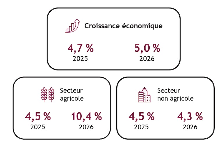 Après une année 2022 atone, limitée à +1,8% sous l’effet d’une sécheresse historique, le PIB a enregistré un rebond à +3,7% en 2023. Les projections actuelles indiquent désormais une accélération graduelle de l’activité, avec une croissance appelée à atteindre près de 5% en 2026.