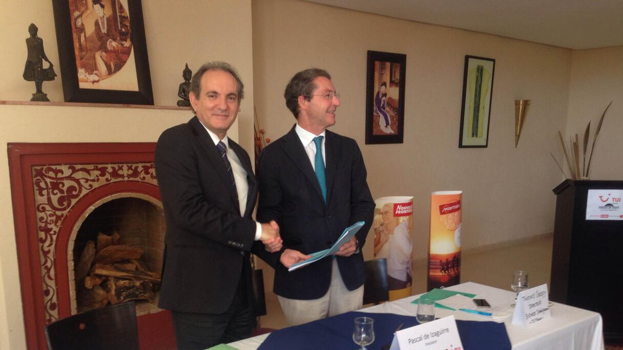 En présence de Abderrafia Zouitene, directeur général de l’Office national marocain du tourisme (ONMT), Pascal de Izaguirre, président du groupe TUI France, et Othmane Cherif Alami, président du groupe Atlas Voyages, s’est tenue, jeudi, la signature d’un protocole d’entente, pour communiquer et promouvoir ensemble la destination Maroc, dans le but d'asseoir la position du Maroc comme première destination hors Europe pour les touristes français. TUI France au Maroc est présente avec Marmara et également avec la marque Nouvelles Frontières, avec des circuits découvertes, des voyages sur mesure et de nombreux hôtels dans l’ensemble du Maroc. Le groupe compte sur un soutien historique, celui d’Atlas Voyages, partenaire du groupe. Sur l’exercice 2013-2014, TUI France a fait venir plus de 150 000 clients au Maroc. Ce mois d’octobre a connu aussi l’organisation de la convention annuelle des Forces de Vente TUI France à Marrakech. Acte symbolique et geste fort qui montre la confiance du tour-opérateur et sa volonté de continuer son développement au Maroc."Nous sommes venus à Marrakech avec les forces de vente du réseau TUI France: c’est un geste symbolique très fort de notre soutien à la destination qui traduit les relations d’amitié et de confiance que nous entretenons depuis toujours avec le Maroc. Notre volonté est de nous engager sur le long terme avec un programme ambitieux d’investissement pour développer une offre de qualité qui réponde aux attentes de nos clients, que ce soit dans les clubs Marmara ou les voyages sur mesure avec Nouvelles Frontières, et faire découvrir les richesses du Maroc", a déclaré Pascal de Izaguirre, président de TUI France. Le groupe a également annoncé la construction de deux nouveau hôtels, à Marrakech et Agadir, pour un investissement de l'ordre de 15 millions d'euros.