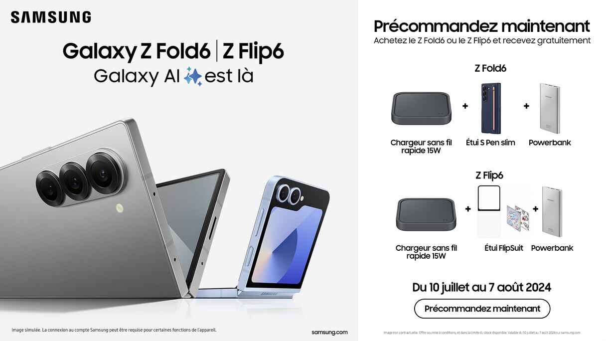 Pour toute précommande effectuée entre le 11 juillet et le 4 août 2024, Samsung offre des accessoires exclusifs comme l’étui Slim S-Pen et un chargeur sans fil pour le Galaxy Z Fold6, ainsi que l’étui Flipsuit et un chargeur sans fil pour le Galaxy Z Flip6. De plus, le service Samsung Care+ propose des protections spéciales pour les nouveaux appareils à des tarifs préférentiels.