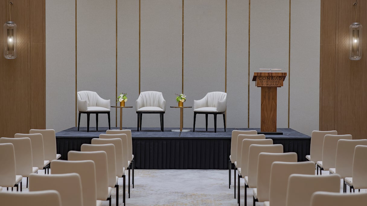 Avec ses 1.260 mètres carrés d’espaces de réunion répartis sur huit salles équipées des technologies les plus modernes, le Conrad Rabat Arzana peut accueillir jusqu’à 350 invités. La salle de bal Saphir, avec ses 411 m², permet d’organiser des banquets pour 250 convives, tandis que la Terrasse Turquoise offre un cadre extérieur unique pour des réceptions de 150 personnes. L’Event Room Aquamarine, baignée de lumière naturelle grâce à ses grandes baies vitrées, accueille jusqu’à 90 invités dans une ambiance sereine. Les salles Tanzanite, Topaz et Lapis Lazuli, idéales pour des groupes plus intimes de 20 à 40 personnes, offrent des configurations sur mesure.