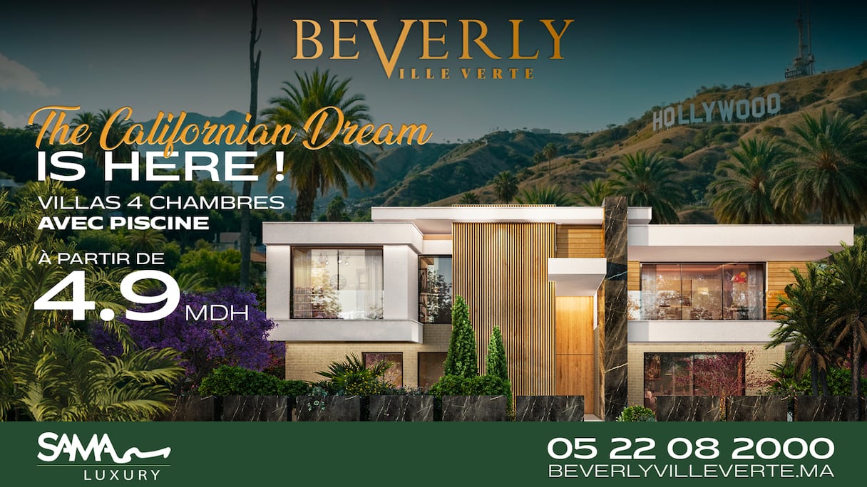 Marque du groupe immobilier Sama Invest, Sama Luxury dévoile Beverly Ville Verte, un ensemble de villas de luxe appelé à devenir une référence dans le paysage immobilier. Situé, comme son appellation le suggère, à l’entrée de la Ville Verte de Bouskoura, le projet propose quatre types de villas, conçues pour satisfaire les exigences et les goûts de chacun, le tout dans un écrin de verdure.