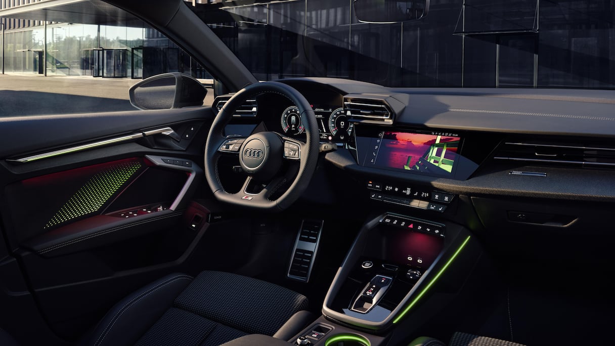 L’Audi A3 propose également, en option, un éclairage intérieur qui met en valeur les portières et l’espace pour les pieds, des éléments d’éclairage supplémentaires et un éclairage de contour du MMI et des seuils de porte. L’éclairage de contour fait aussi le tour de la console centrale et les porte-gobelets de série sont éclairés. Toujours en option, l’intérieur des portes avant peut être largement éclairé pour rendre encore le design plus captivant.