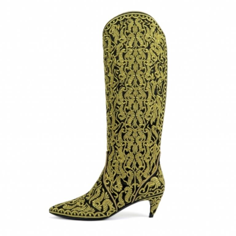Bruno Frisoni, directeur artistique de la célèbre marque Roger Vivier, se montre très inspiré cette saison et nous propose une version botte de la babouche. «Ce modèle a été inspiré par des babouches achetées cet été au Maroc», déclare ainsi le directeur artistique qui possède un pied-à-terre à Tanger. Pour la petite histoire, «la paire en question serait supposée avoir appartenu à une princesse du 18ème siècle», déclare-t-il au passage. Ornées de riches broderies, ces bottes sont sans conteste la pièce extravagante à shopper ce printemps.