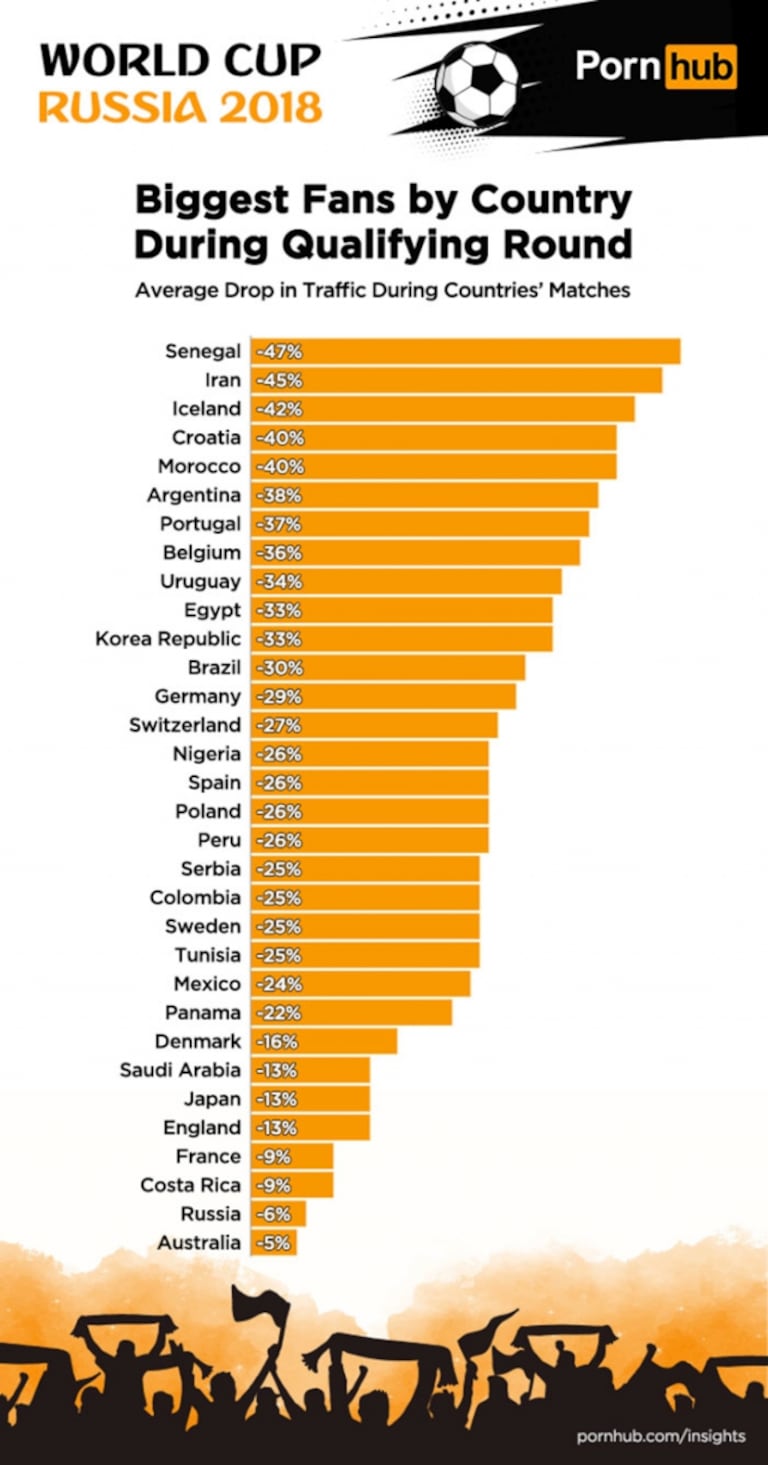 Toutefois, à en croire les statistiques en baisse de la plateforme, les supporters les plus fidèles à la Coupe du Monde sont:Les Sénégalais: (-47%)L’Iran (-45%)L’Islance (-42%)La Croatie (-40%)Le Maroc (-40%)