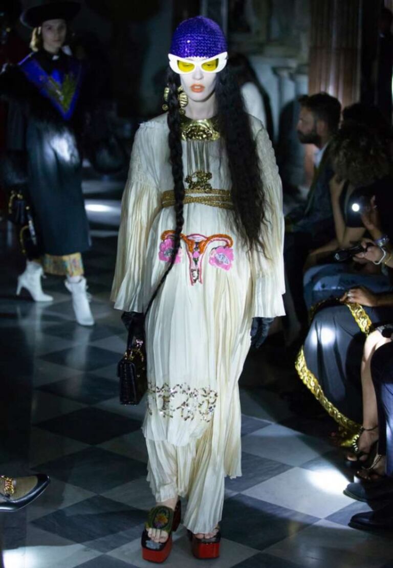 Présentée au musée du Capitole à Rome, la collection Cruise de Gucci a donné à voir quelques pièces emblématiques du point de vue de Alessandro Michele sur le droit à l'avortement.