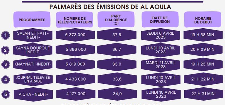 Plus en détails, Al Aoula décroche une part d’audience de 27,6% en augmentation par rapport à la deuxième semaine du ramadan, contre 38,3% pour 2M. La capsule humoristique «Salah et Fati» arrive toujours en tête du peloton sur la première chaîne avec 6,3 millions de téléspectateurs et 37,6% de part d’audience. En deuxième position, on retrouve la série «Kayna Dourouf», qui chasse le sitcom «Knaynati» de la deuxième place du top 5 après avoir attiré 5,8 millions de téléspectateurs et gratté une part d’audience de 36,7%.